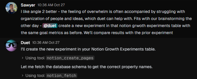 Duet is a high performance messaging platform that enables teams to get work done lightning fast. It's self-organizing, context-rich, and MCP-native